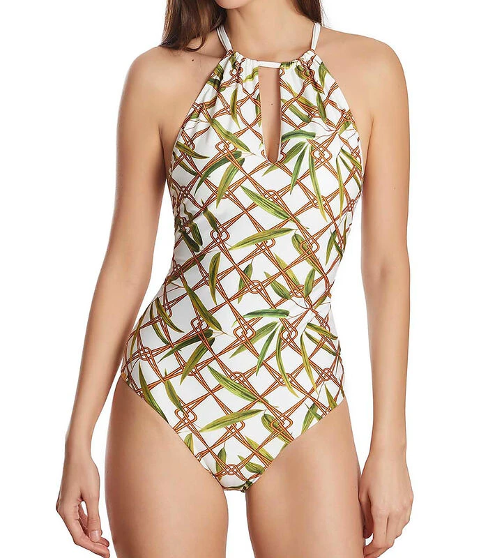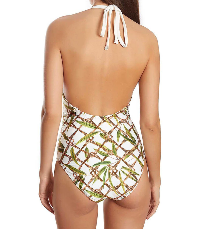 Eendelig zwempak met romp en halslijn, met een dunne opening voor het decolleté. De bandjes zijn multi–positioneel: ze kunnen in de nek geknoopt worden, of op de rug op een klassieke manier of gekruist. Heldere patronen met een vleugje verfijning die u niet onverschillig laten. Durf deze collectie van pure stijl aan!