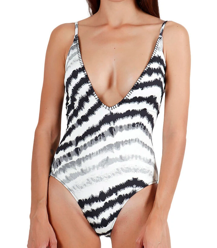 Zeer sexy zwempak met een ultra plunging decolleté aan de voorkant. Stropdas– en kleurstofprints in strepen geven het een originele etnische look. De beugelvrije cups zijn voorzien van uitneembare schelpen om zich aan uw borsten aan te passen. De V–halslijn is afgezet met fijne geschulpte naden voor een nog vrouwelijker accent. Op de rug kruisen en verstrengelen de dunne bandjes elkaar en sluiten ze door een knoop in het midden van de rug. Zachte, elastische en comfortabele beencontouren. De binnenvoering maakt het een zeer comfortabel en aanpasbaar zwempak.[Admas zwemkleding valt klein uit, dus we raden u aan de volgende maat groter te bestellen.[Badpak wordt alleen verkocht. De sieraden en accessoires die het model op de foto’s draagt, zijn niet inbegrepen bij het zwemkostuum].