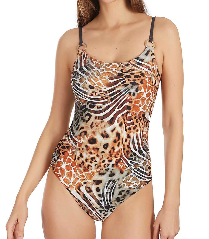 Eendelig voorgevormd zwempak zonder beugel met vierkante halslijn. De dunne bandjes zijn verstelbaar en versierd met een glamoureuze gouden ring. De halslijn aan de achterkant is laag en smaller. De trendy dierenprint is een gedurfde combinatie van luipaard– en zebrapatronen.