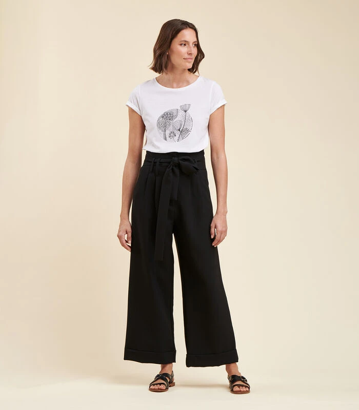 Loszittende, hoog getailleerde broek met riem en wijde pijpen. Twee haak en oog sluitingen, verwijderbare geknoopte tailleband, ritssluiting.