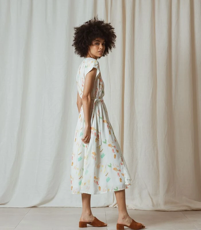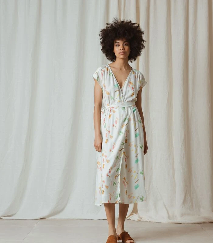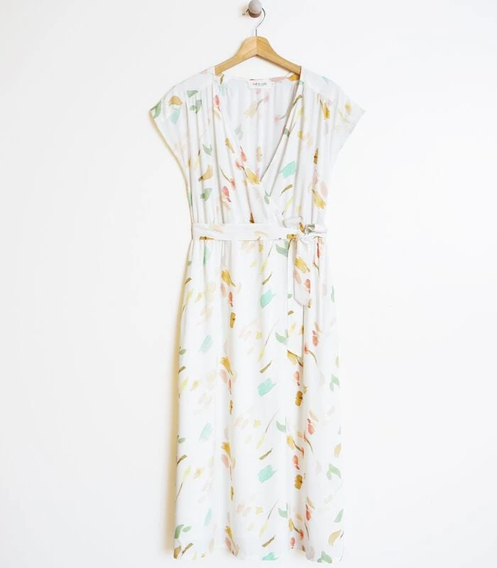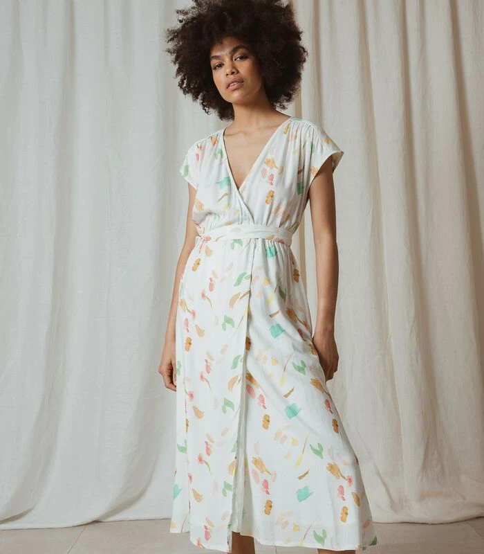 Wij houden ervan om uit elk stuk het maximum te halen. Deze jurk met V–hals, een elastische taille en midi lengte is stijlvol, maar toch gemakkelijk te dragen. De aquarel bloemenprint op duurzame viscose maakt het geheel af.