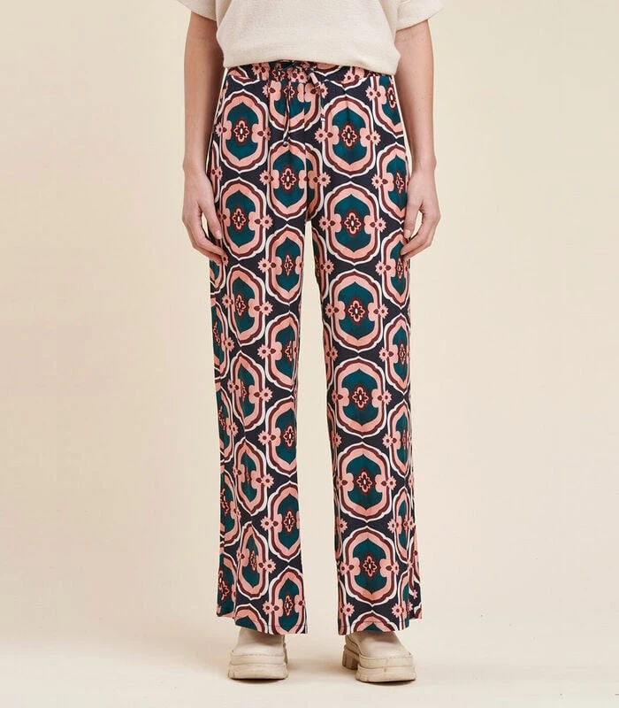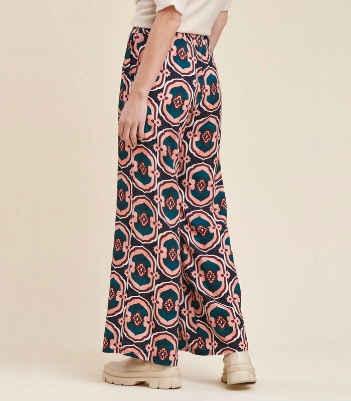 Deze broek heeft een elastische tailleband, Italiaanse zakken en is bedrukt op de achterkant.Ons model is 1m75 en draagt maat 36/S.Dit model heeft een normale maat, neem uw gebruikelijke maat. 100% Viscose
