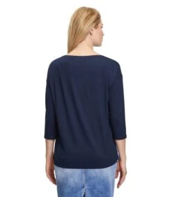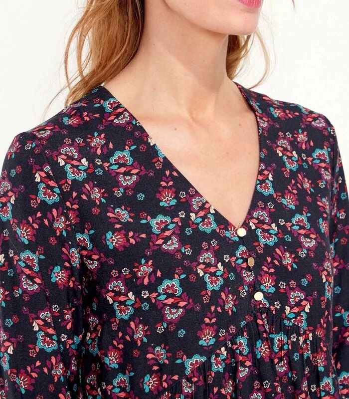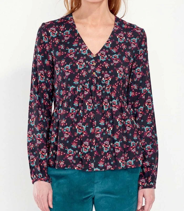 Zachte, soepelvallende blouse die zeer comfortabel draagt met zijn uitlopende snit die niet aftekent, en benadrukt met zijn vrouwelijke V–hals, afgewerkt met een reeks kleine gouden knoopjes vooraan.
