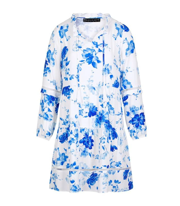 Wie heeft er niet van gedroomd om op vakantie te gaan naar Griekenland? De MYKONOS jurk verleidt met zijn blauwe bloemenprint op een witte achtergrond, zijn luchtig volume en zijn ladderdagvlecht.