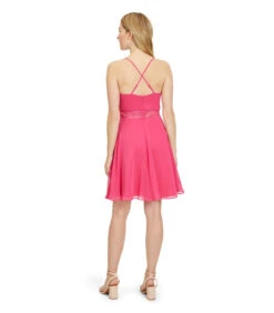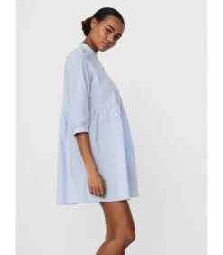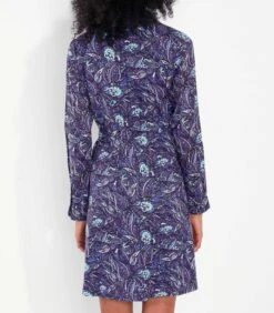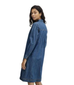 Deze bordeauxrode midi–jurk is gemaakt van geweven tencel. Het heeft een kraag en een blinde sluiting aan de voorzijde met plastic knopen. De mouwen zijn 7/8 lang met manchetten in dezelfde stof en splitjes aan de uiteinden. De jurk heeft hangende schouders. Er is een optionele ceintuur in dezelfde stof. De zoom is afgerond met lange splitten van 40 cm aan de zijkanten.
