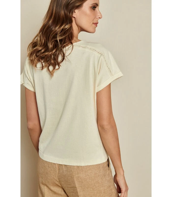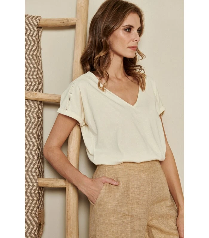 Crèmekleurige T-shirt Met Korte Mouw En V-hals