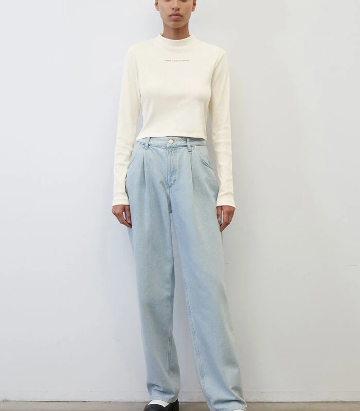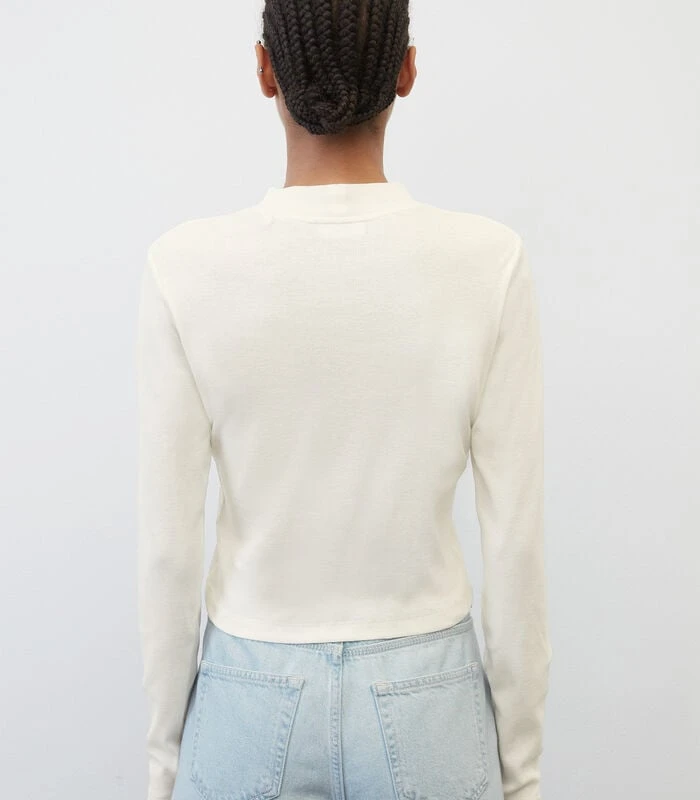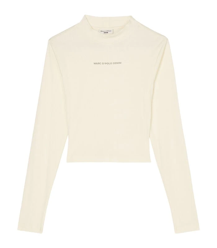Laat in combinatie met een jeans met hoge band de taille perfect uitkomen: het cropped T–shirt met lange mouwen. Supercasual, kort en smal shaped model van moderne, fijne geribde jersey van een elastische, hoogwaardige mix van biologisch katoen. Met halfhoge opstaande kraag en contrasterende, subtiele logoprint op de borst.