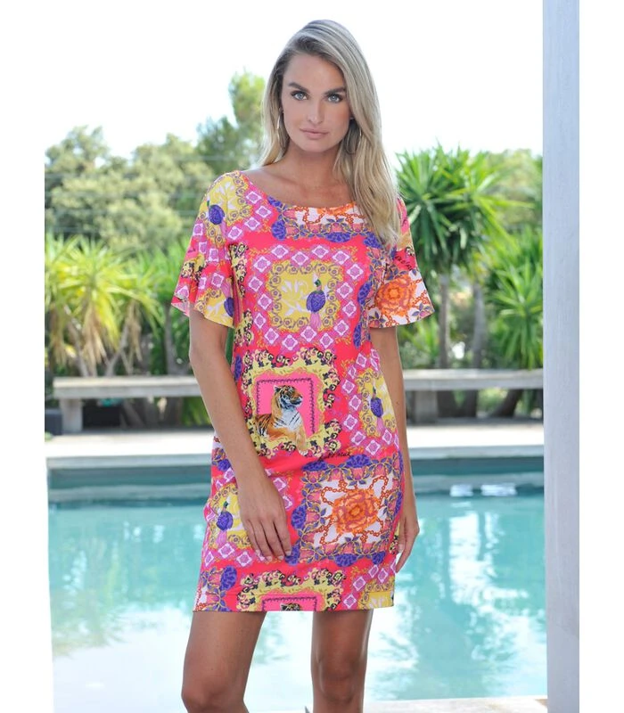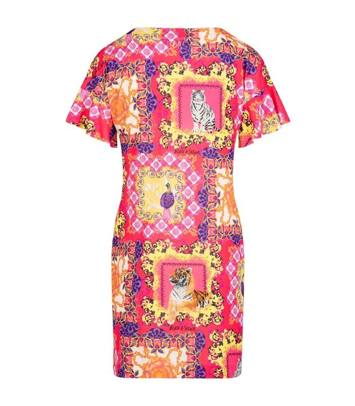 Een explosie van kleur voor de DANY jurk! Dit seizoen behoudt het zijn rechte snit en zijn mouwen met ruches waar we zo van houden, terwijl het een gedurfde en unieke print onthult.