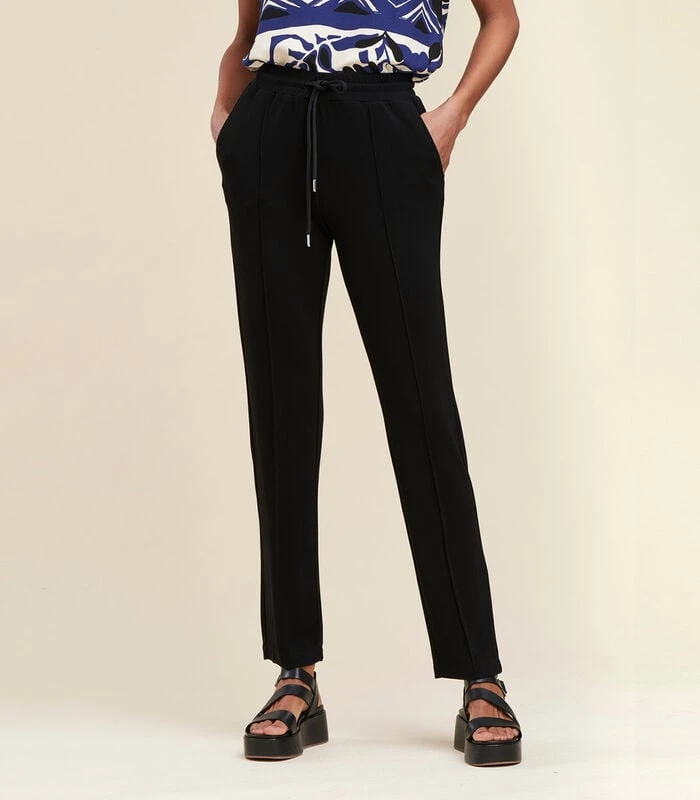 Uiterst comfortabele broek van viscose jersey, elastische tailleband met aantrekkoord en koordjes, geribde plooien halverwege de pijpen, Italiaanse zakken (schuin aan de zijkanten).Ons model is 1m77 groot en draagt maat 36/S.Dit model valt normaal, neem uw gebruikelijke maat. 95% Viscose 5% Elastaan