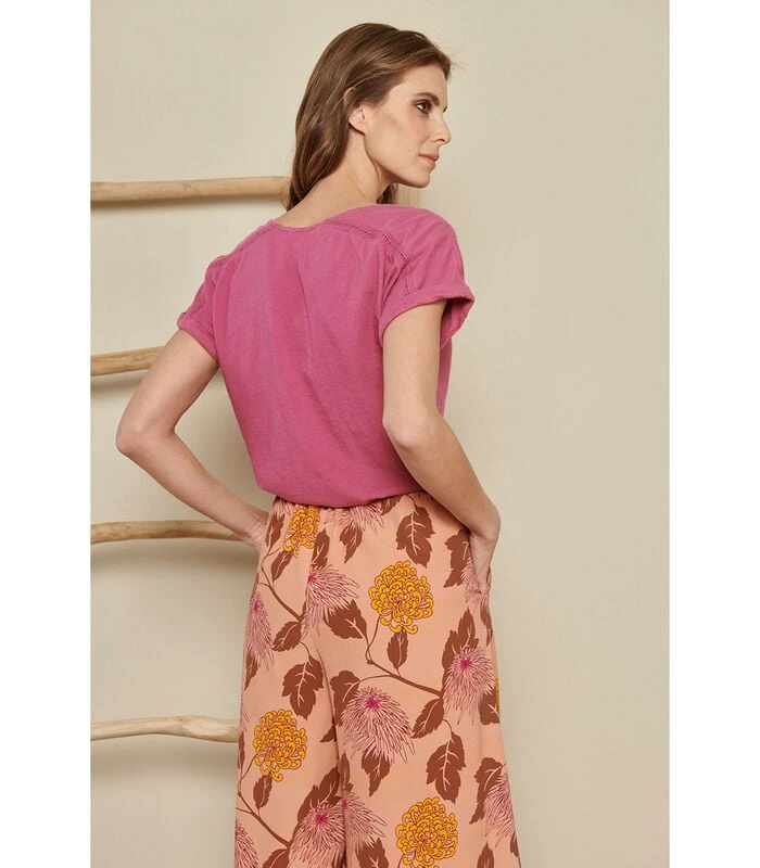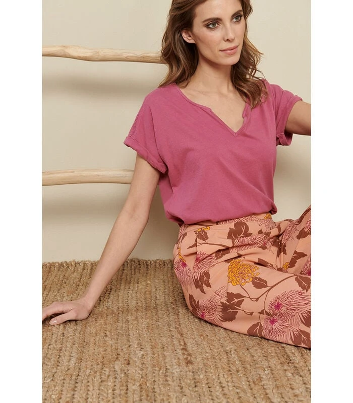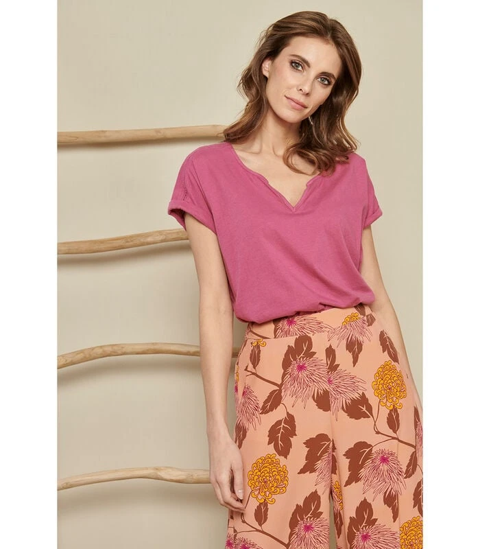 Frambooskleurige T-shirt Met Korte Mouw En V-hals