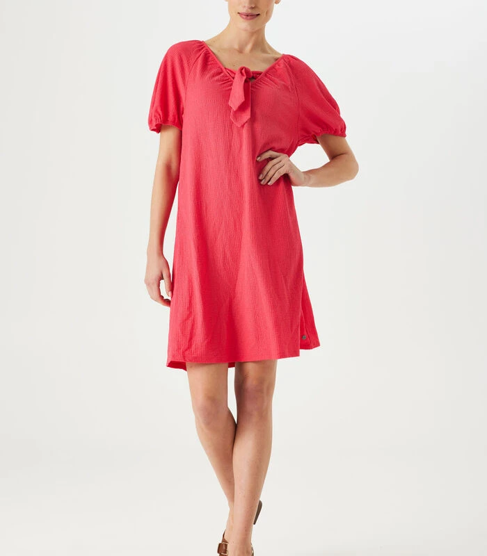 Rechte jurk met strikbandjes. De jurk heeft een V–hals, elastiek in de boorden en een regular fit. Dit item is gemaakt van 98% polyester en 2% elastaan.