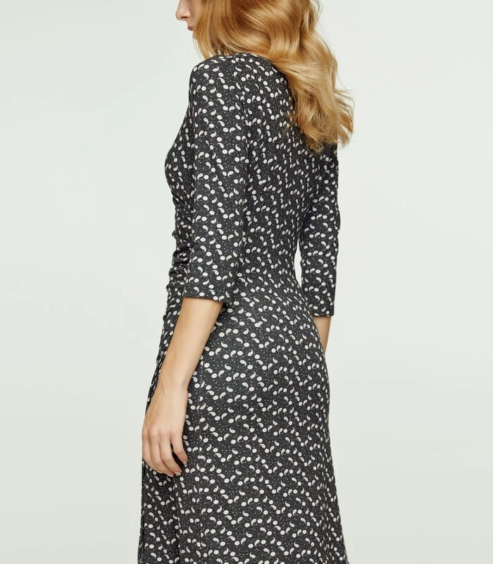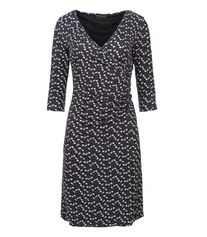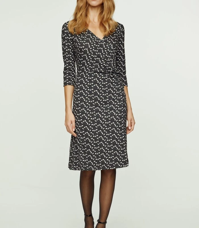 Imitatiewikkeljurk van stretchjersey: viscose–elastaan. Driekwartmouwen. Dubbele stof aan de voorkant. Zwarte bies in de halslijn. Lichtjes geplooid links in de taille. Voering van stretchstof aan de achterkant.