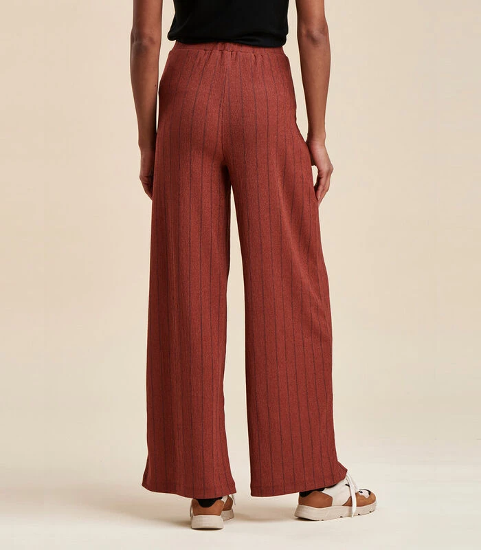 Gestreepte jersey broek met wijde pijpen en elastische tailleband.Het model is 1m77 lang en draagt maat 36/S.Dit model valt normaal, neem uw gebruikelijke maat. 94% Polyester 5% Viscose 1% Elastaan