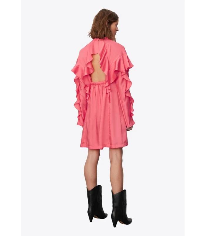 Deze knielange jurk heeft een ruche aan de voor– en achterkant en aan de mouwen. Het heeft een open rug met een elastische band in het midden van de rug en twee haaksluitingen in de nek.