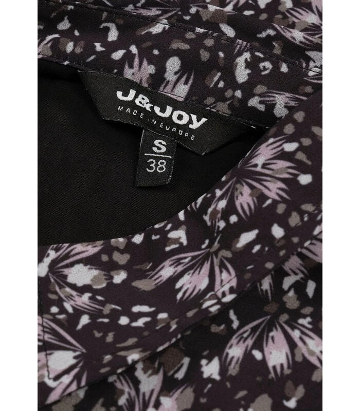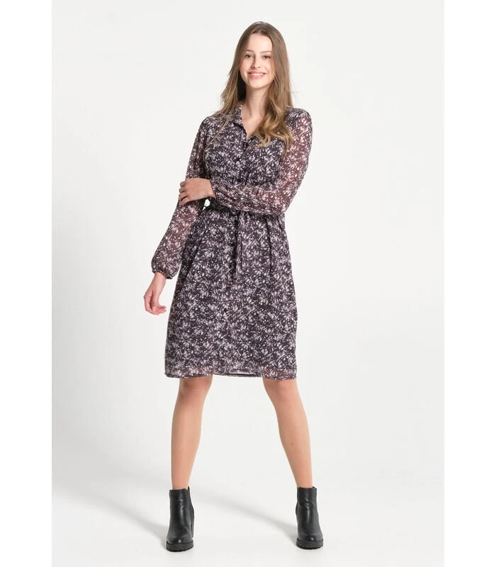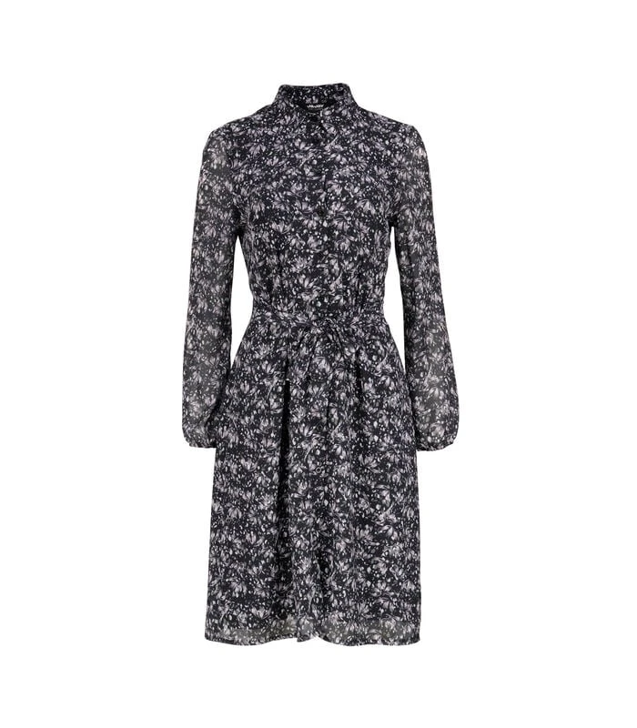 Lange jurk met een intens zwart verbeterd met bloemenpatroon in zachtroze tinten en beige. Hart Cache kraag en lange mouwen. De grootte wordt onderstreept door een riem. Het contrast van kleuren en de delicatesse van het patroon maken het een zeer chique kamer die we deze winter zonder moderatie zullen dragen.