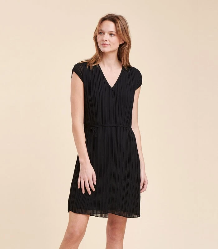 Korte getailleerde jurk van geplooide polyester voile, V–hals met biais afwerking, korte vallende mouwen, dunne strikbandjes, jersey voering. Lengte: 90 cm.Ons model is 1m77 lang en draagt maat 36/S.Dit model is getailleerd gedragen, neem een maat boven uw gebruikelijke maat voor een meer casual wear. 100% Polyester