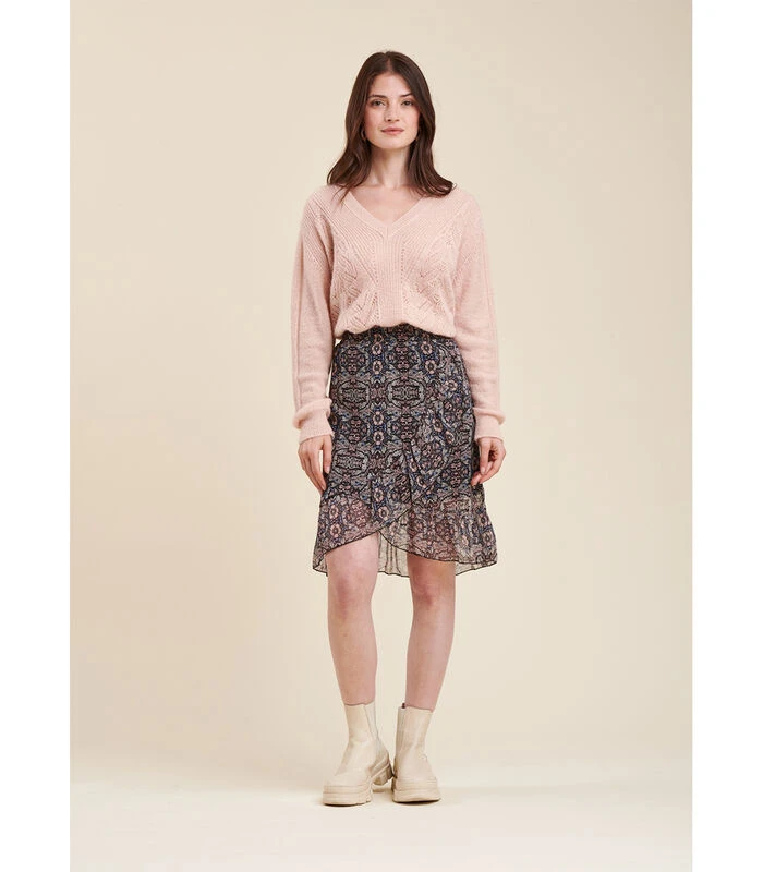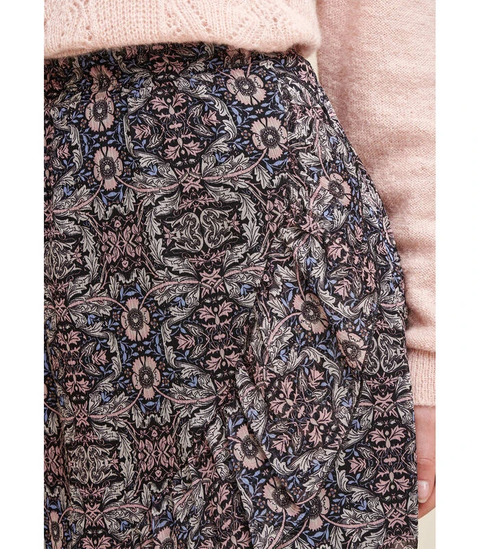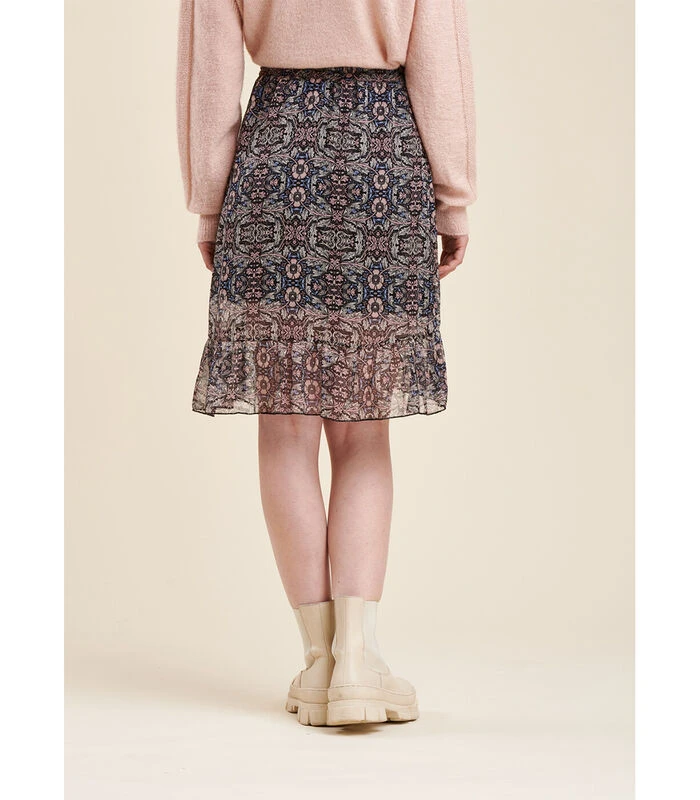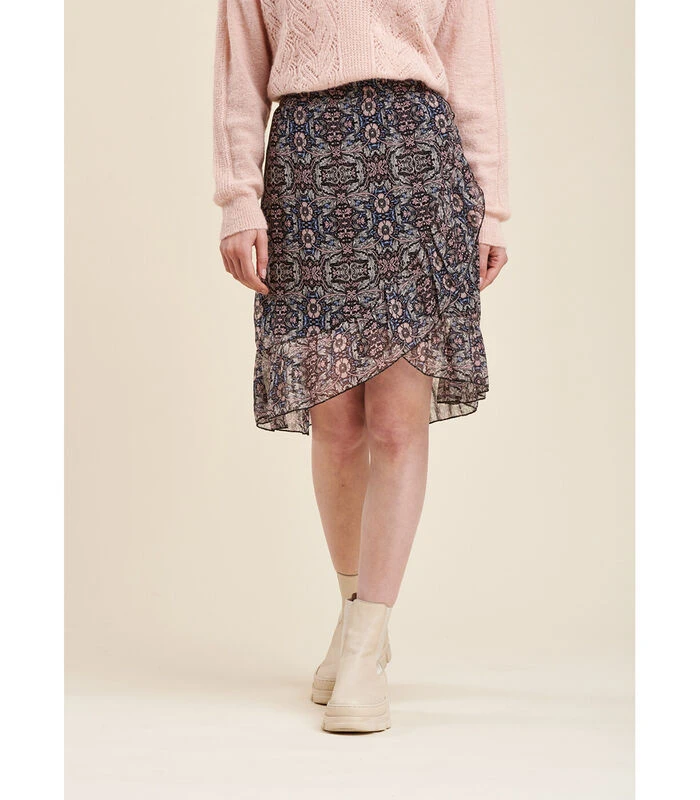 Korte rok met bloemrijke print in polyester sluier, elastische grootte, portemonnee –effect met ruches. Gevoerde rok. Lengte: 57 cm. Ons model meet 1m70 en heeft een maat 36/s. 100% Polyester Voering: 100% Viscose