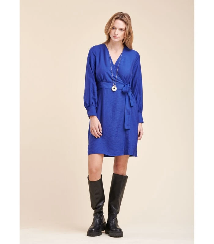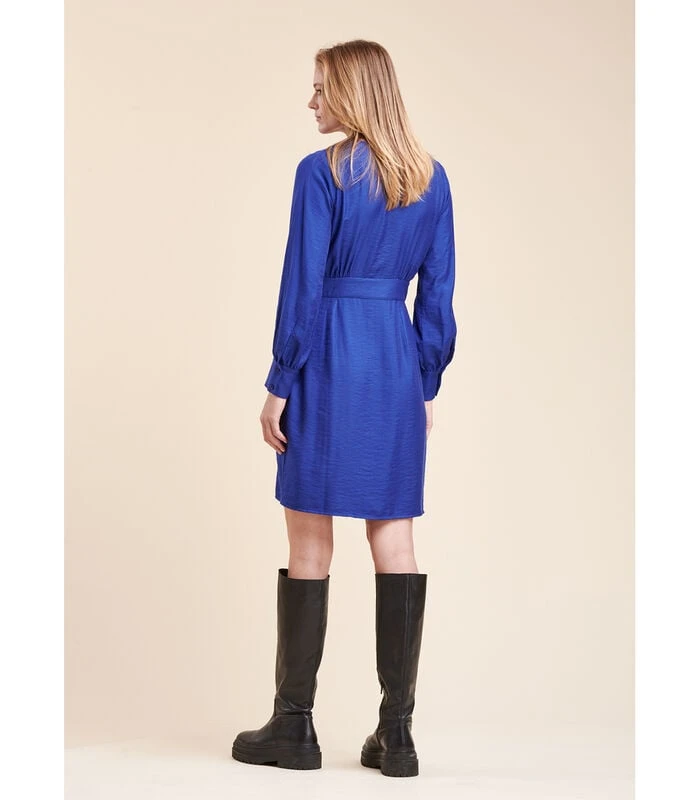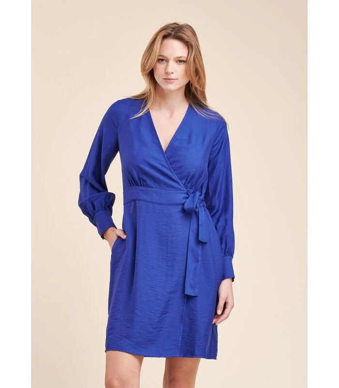 Korte portfolio –jurk, lange mouwen met grote polsen en verzamelingen, snijgrootte met klein paneel, zakken in het naaien, riem om te binden. Lengte: 95 cm. Ons model meet 1m75 en heeft een maat 36/s. 85% Viscose 15% Polyamide