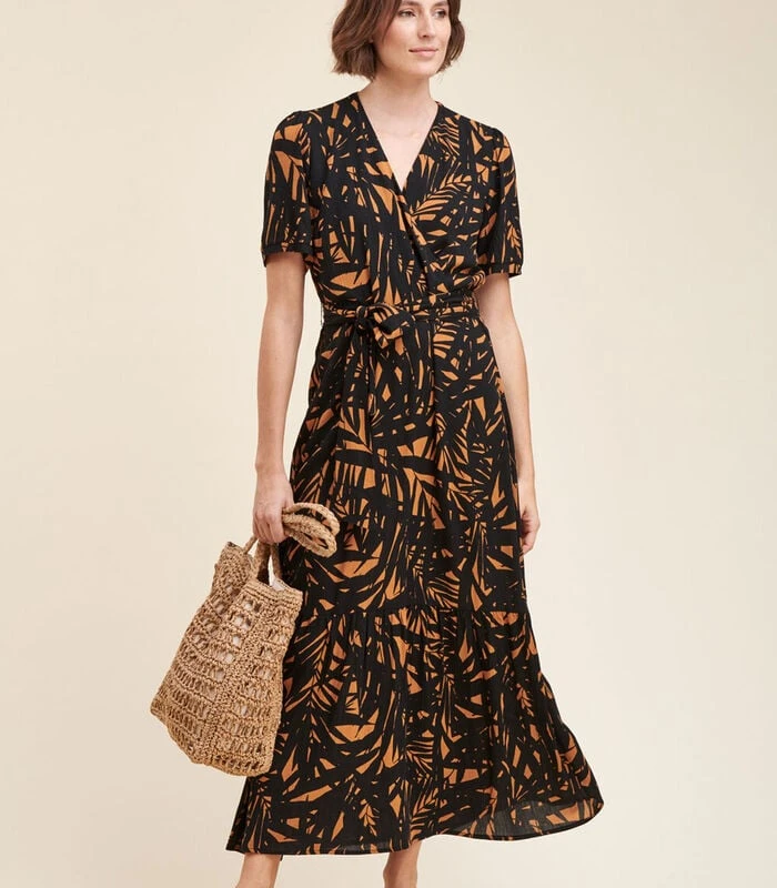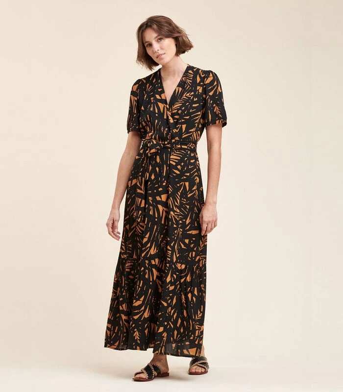 Lange jurk met tweekleurige plantaardige print, omslaghals, korte mouwen met klein armbandje, elastische taille met ceintuur om te strikken, aangerimpelde onderkant. Lengte: 140 cm.Ons model is 1m77 lang en draagt maat 36/S.Dit model heeft een normale maat, neem uw gebruikelijke maat. 100% Viscose