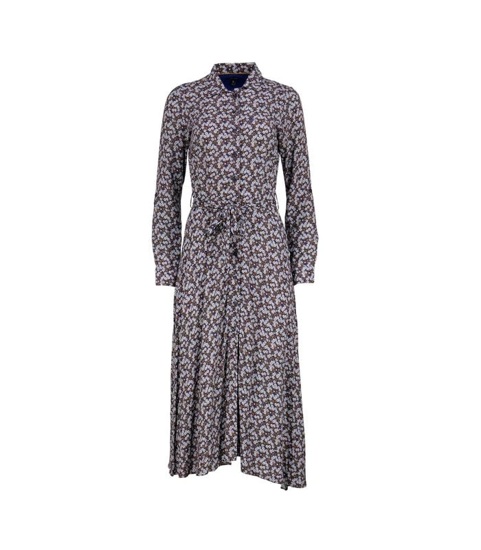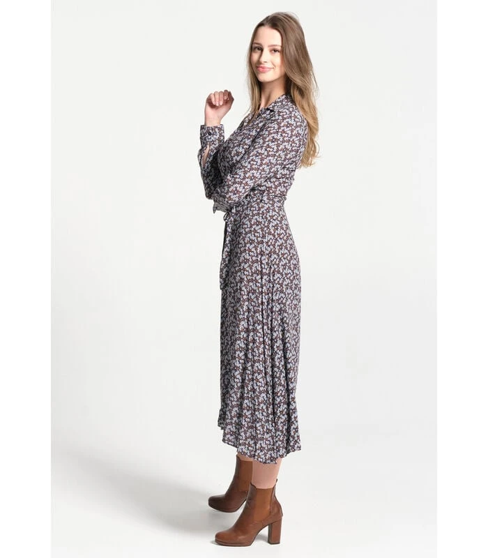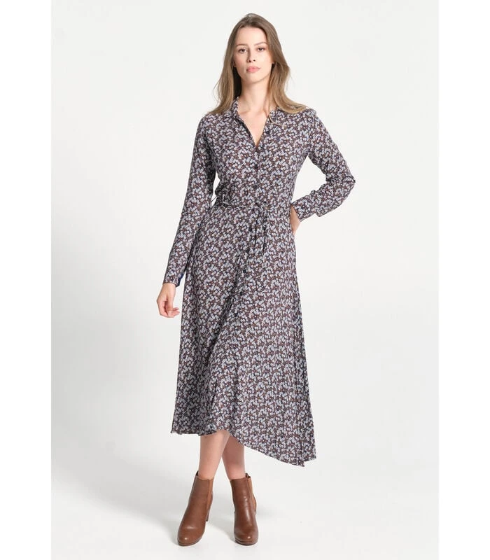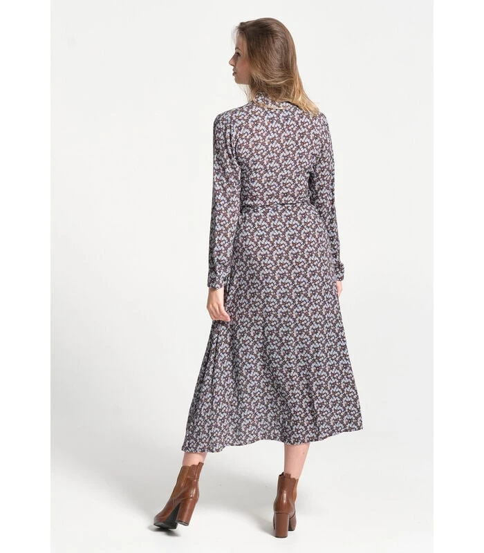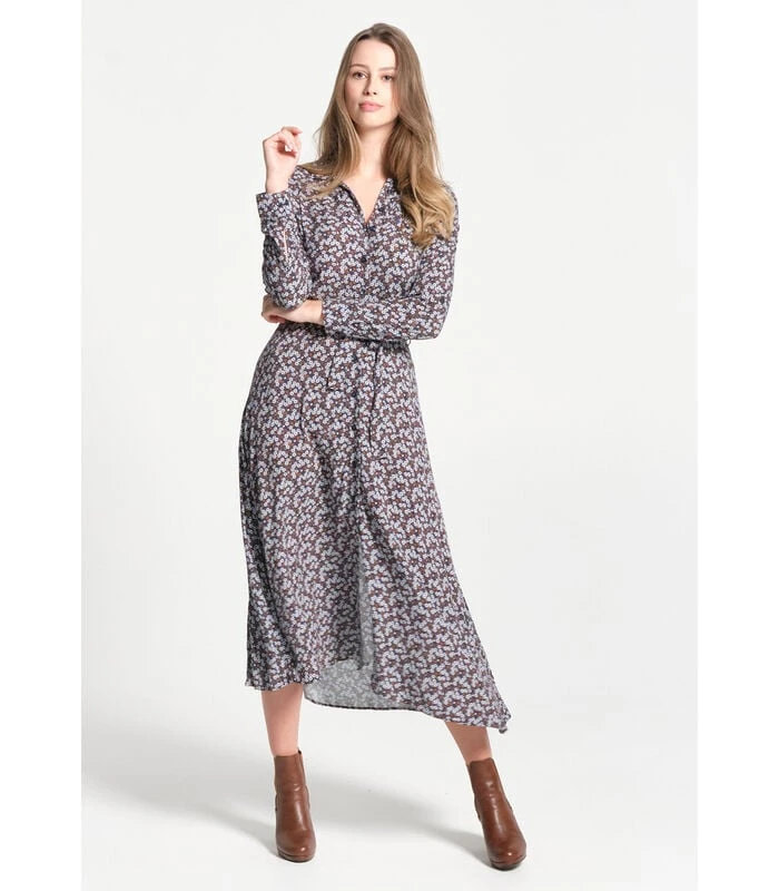 Lange jurk met shirt en kraag van knoopsgat. De mouwen zijn lang. De grootte wordt enigszins onderstreept door een te verbinden riem. De textuur is vloeiend. We houden van zijn retro –stijl en de bloemenprint in herfstkleuren. De perfecte ruimte voor dit seizoen.