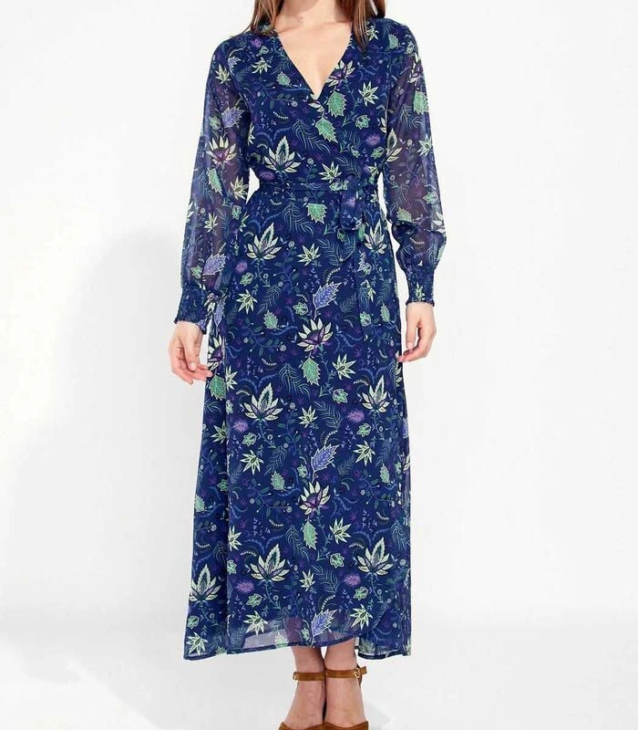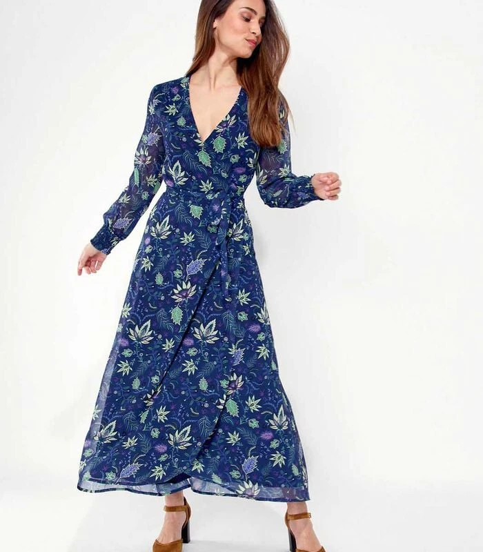 Soepele en vrouwelijke wikkeljurk met een grote Vâhals en zijn lichtspel door transparante stof van de mouwen, vast te knopen in de taille waardoor aan te passen aan alle lichaamsvormen.