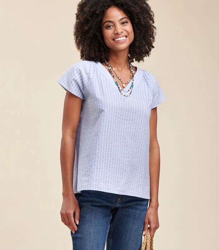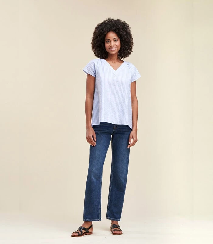 Een losvallende top van katoenen voile met fijne strepen, V–hals omzoomd door een brede band, plooien aan de hals, zeer korte raglanmouwen.Het model is 1m77 groot en draagt maat 36/S. 100% Biologisch Katoen