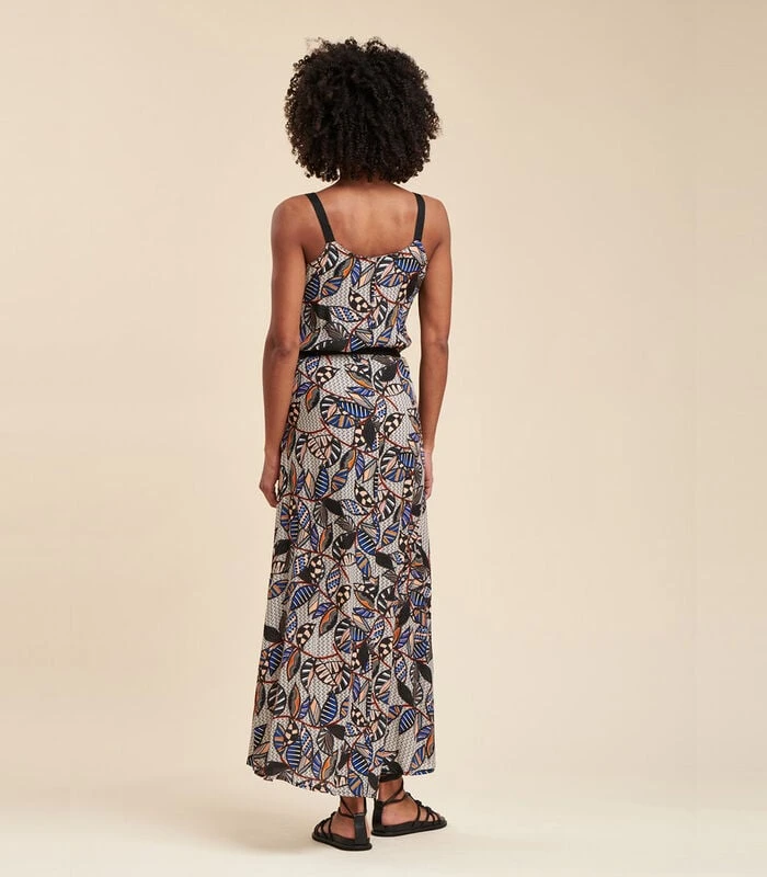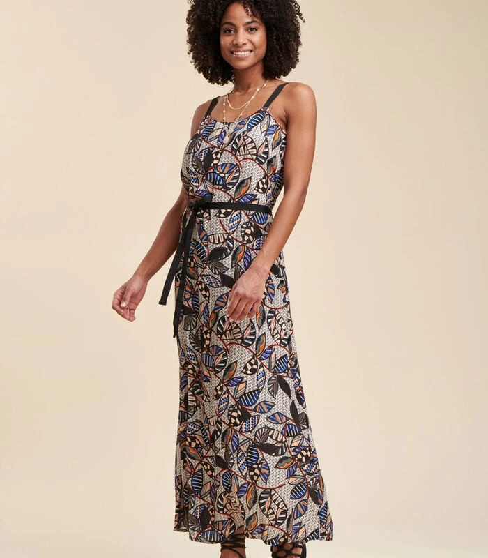 Losvallende lange jurk met plantaardige print, ronde hals, grosgrain bandjes, grosgrain riem. Lengte: 125 cm.Ons model is 1m77 lang en draagt maat 36/S.Dit model heeft een normale maat, dus neem uw gebruikelijke maat. 100% Viscose