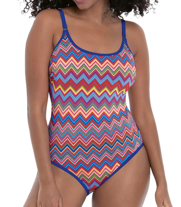 Modieus zwempak uit de Magic Wave serie met kleurrijk zigzagpatroon. Gevoerd bij de buste. Ronde, lage rughals en smalle, verstelbare bandjes. Een kleurrijke metgezel voor uw volgende strandvakantie!