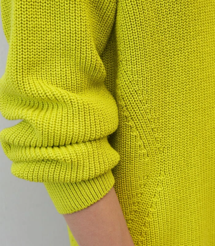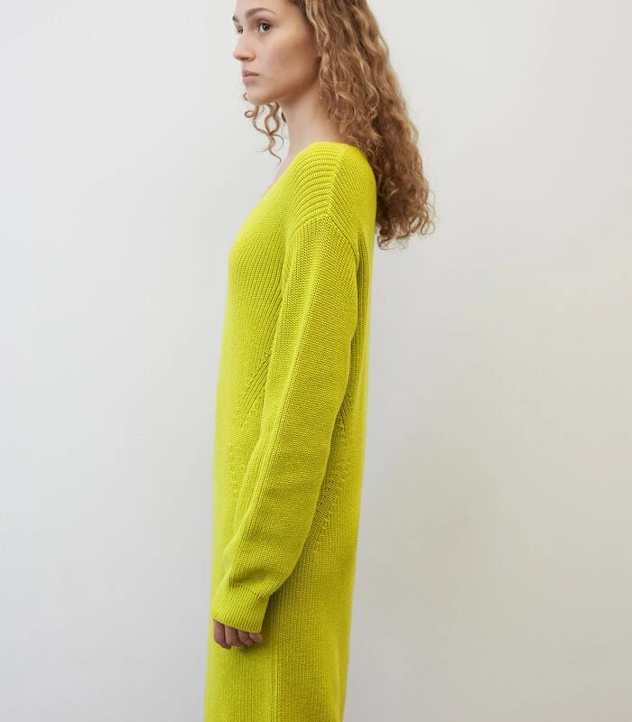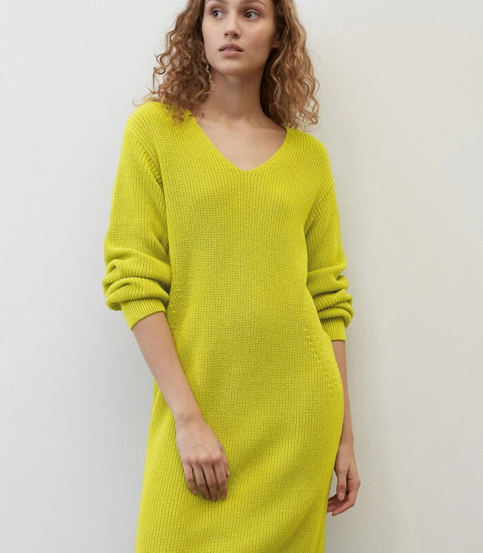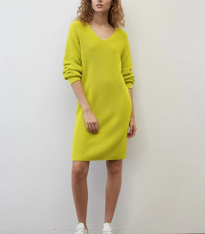Big fashion love: gebreide jurken! Relaxed, met aangename pasvorm en hoog draagcomfort. Het model van compact, zuiver biologisch katoen met gemiddeld gewicht, heeft een klassiek patroon van halve patentsteken en overtuigt met een casual, licht getailleerde fit en een opvallende structuur. Met lage, afgeronde V–hals, lange mouwen en een rechte zoom. De jurk is een echte allrounder en kan op allerlei manieren worden gecombineerd tot de meest uiteenlopende looks – sportief met sneakers, elegant met high heels of casual met loafers.