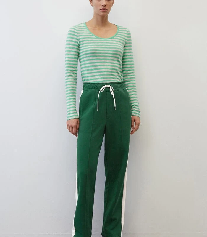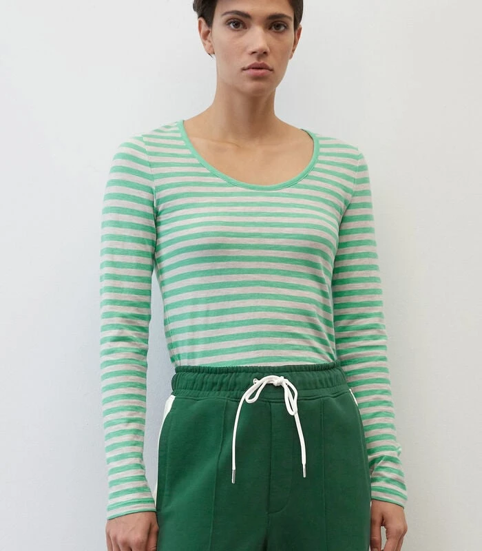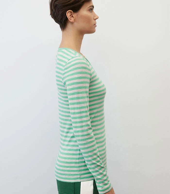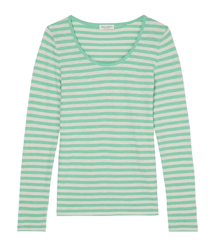 Stijlvol gecombineerd met een blazer of sportief met een vest of leren jack – met een gestreepte longsleeve zit u altijd goed voor casual looks. Of het nu voor op kantoor, een doordeweekse dag of op reis is. Model van zuivere, GOTS–gecertificeerde slub jersey met biologisch katoen en wijde, ronde hals en rechte zoom. Hoogwaardig en casual: de strepen van gekleurd garen.