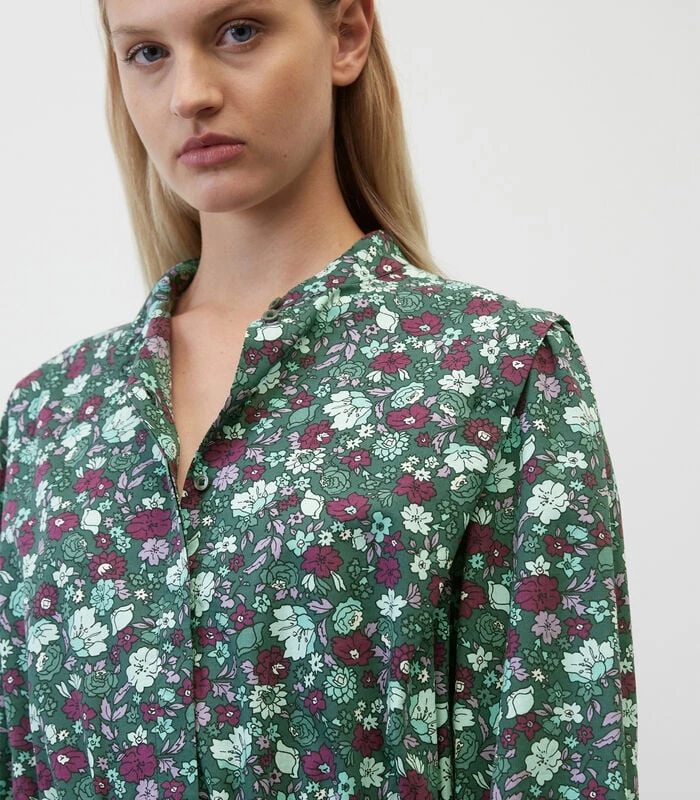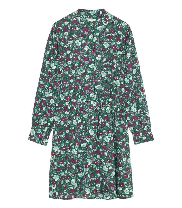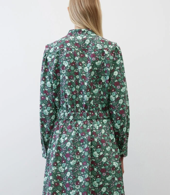 Opvallende mouwen, geaccentueerde schouders in de stijl van de jaren 80 en een in het oog springende, vrolijke, lenteachtige print all–over – dat zijn de belangrijkste kenmerken van deze casual, korte jurk van een zachte, hoogwaardige mix van katoen en lyocell. Het ruimvallende model heeft een opstaande kraag, een blinde halve knoopsluiting, een comfortabele elastische taille, mouwen met opvallend gerimpelde, brede manchetten en een uitlopende, subtiel gewelfde zoom. Voor een supermoderne look: combineer met een ondoorzichtige panty en stoere chunky boots. Valt groot uit – bestel a.u.b. een maat kleiner voor een shaped fit.