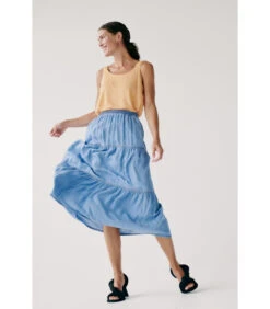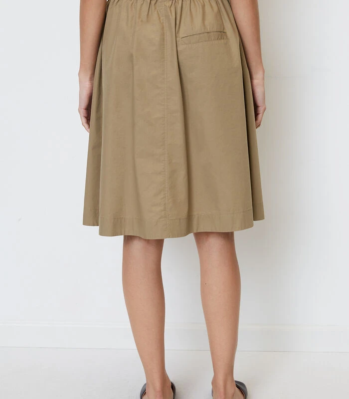 Geen zomer zonder onze zeer geliefde rokken! Nieuw in het modebeeld: knielange, uitlopende rokken met een hoge taille die snel en makkelijk kunnen worden aangetrokken. Dit model zonder sluiting met elastische band en handige steekzakken heeft alle kenmerken van een must have. De rok is gemaakt van hoogwaardig popeline van een mix van organic cotton en lyocell. Casual: de kleine zak aan de achterkant. Combinatietip voor een afwisselende look: draag de rok met een basic wit T–shirt en combineer speels met schoenen. Sportief met sneakers, stoer met bikerboots of vrouwelijk met sandalen – de rok is zeer veelzijdig en past perfect bij alle stijlen.
