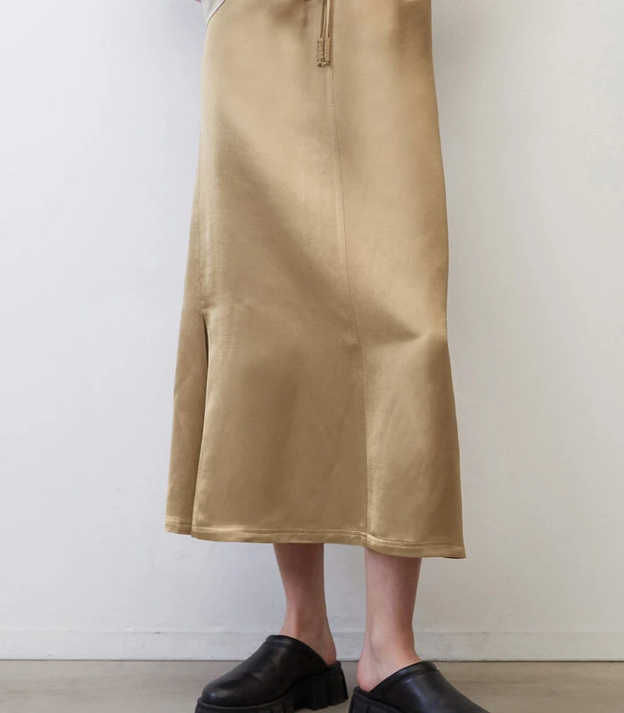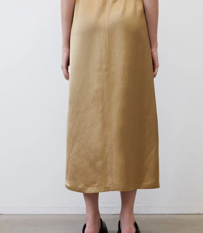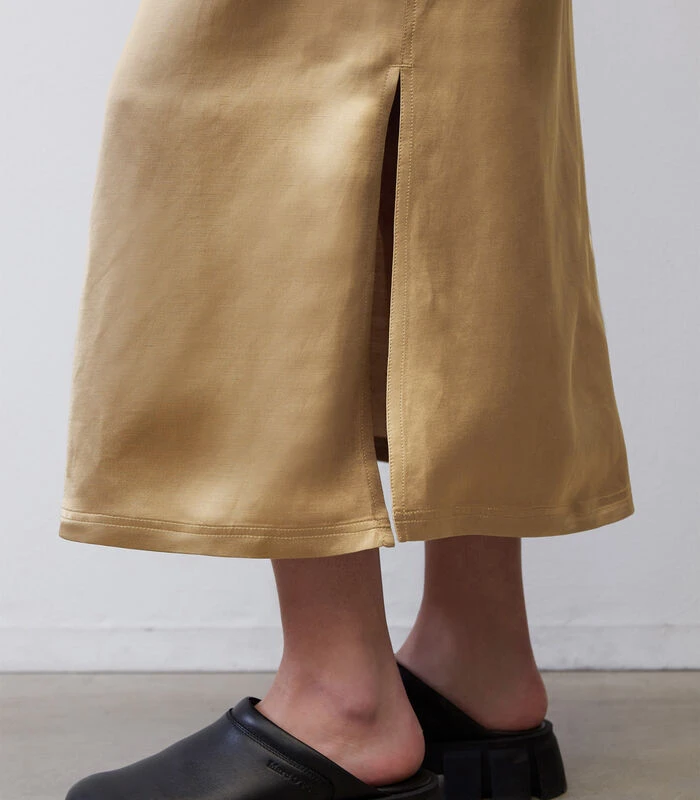 Past altijd bij een wit T–shirt: deze lange soepele rok met A–lijn, gemaakt van een hoogwaardige mix van viscose en linnen. Het model met de elastische taille in joggerstijl heeft een elegant–sportieve touch en een stijlvolle, matglanzende look. De hoge zijsplitten zorgen voor dynamiek tijdens het lopen en geven de rok een extra relaxte look. De uitlopende rok is niet gevoerd en heeft aan de voor– en achterkant een decoratieve deelnaad. Tip voor een modieuze monochrome look: combineer met een qua kleur en materiaal bijpassende blouse.