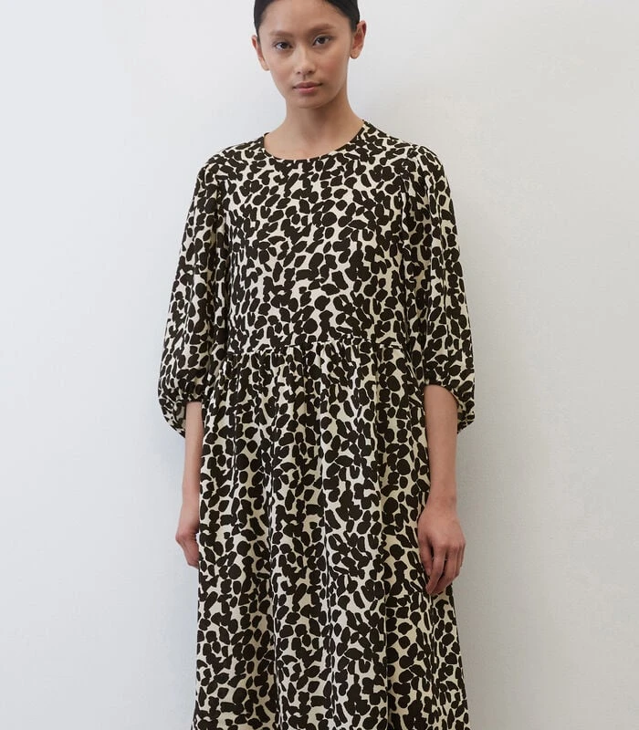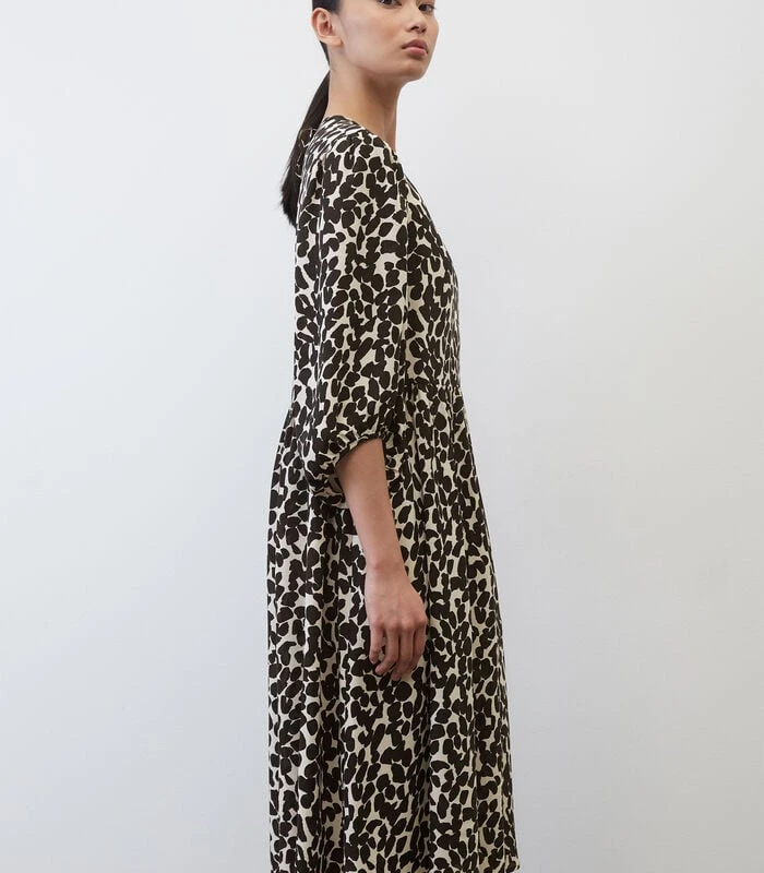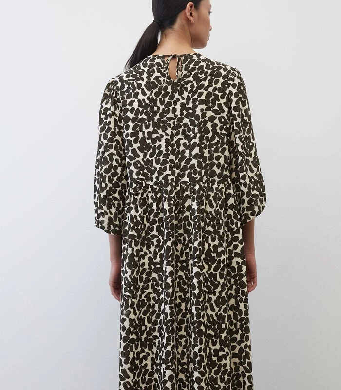 Met volumineus model en vrouwelijke print allāover: kuitlange jurk van een mix van cupro en viscose. Jurken met dit opvallende silhouet worden ook wel wolkenjurken genoemd ā ze zijn zeer flatterend en staan goed bij ieder lichaamstype. Ons model heeft een klassieke ronde hals met een splitje in de nek dat met lange koordjes wordt vastgestrikt. De 3/4āmouwen en aanzetnaad in de taille zijn sterk geplooid en zorgen voor extra wijdte. Handig en cool: de beide in de naad weggewerkte steekzakken. Let op: bij de kleur meerkleurig/groen is het rapport zo groot dat de look van elk individueel model heel verschillend kan zijn en niet altijd overeenkomt met de afbeelding van de jurk in de webshop.
