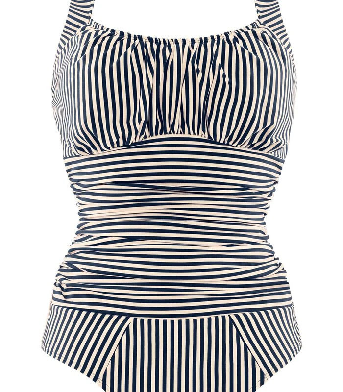 This superb, blue and ecru bathing suit features classic stripes, laid out in a unique pattern to celebrate your female shape and timeless beauty. It is unwired, but padded for comfort, featuring intricate ruching throughout the front. Low cut legs provide ideal coverage while still showcasing those breathtaking curves. And who can resist the adorable little bow, placed strategically on the small of your back?