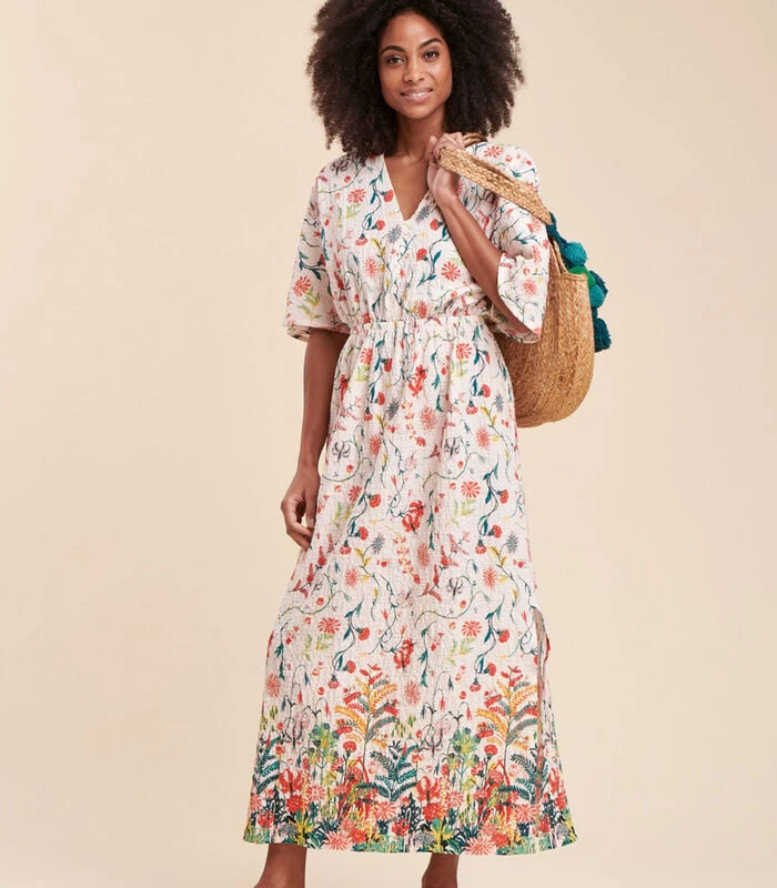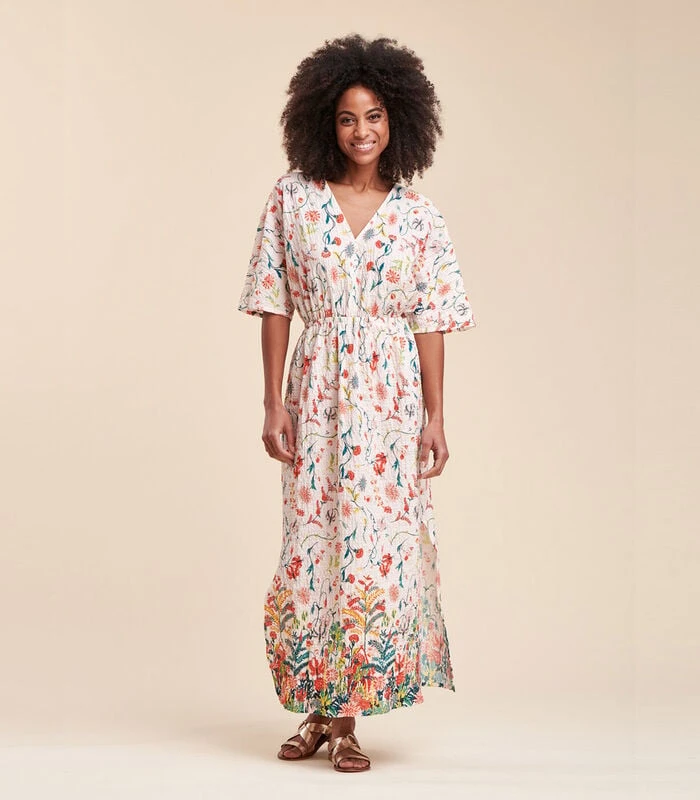 Een katoenen maxi jurk met bloemenprint, V–hals, ellebooglange mouwen, V–hals achter met bandjes, elastische taille, zijsplitten. Lengte: 143 cm.Ons model is 1m77 en draagt maat 36/S.Dit model heeft een normale maat, neem uw gebruikelijke maat. 98% Katoen 2% Elastaan