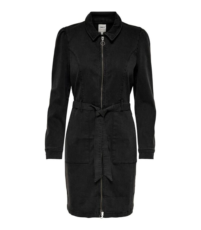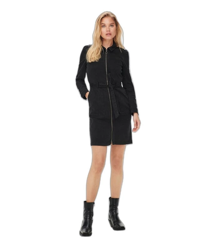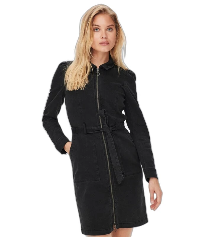 – Denim jurk met lange mouwen– Rits aan de voorkant– Ceintuurtje in de taille– 2 zakken aan de voorkant– Stretchy materiaal– Lengte: 94 cm in maat 36– Het model draagt maat 36