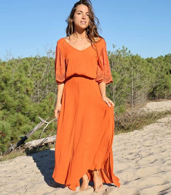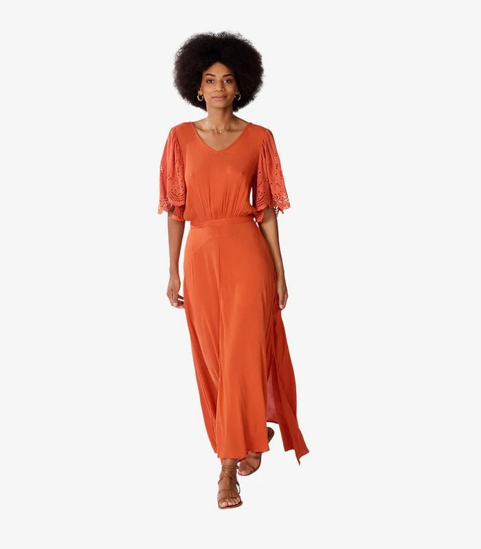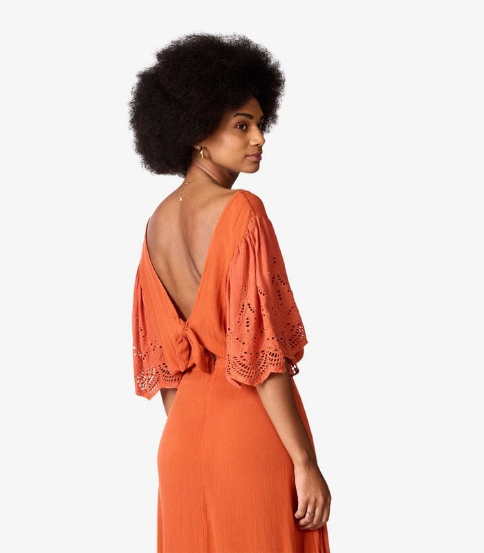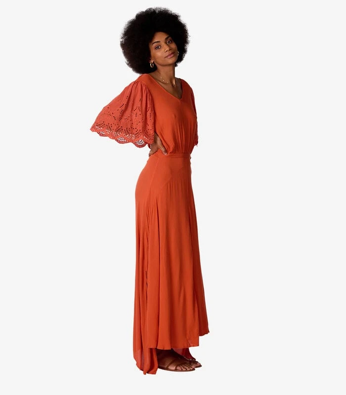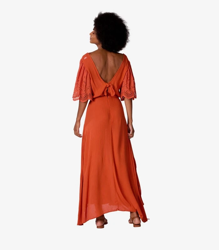 • Lange jurk in gekreukt viscose, V–hals en uitsnijding op de rug