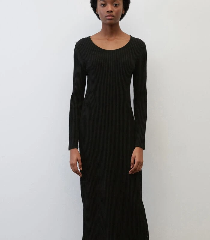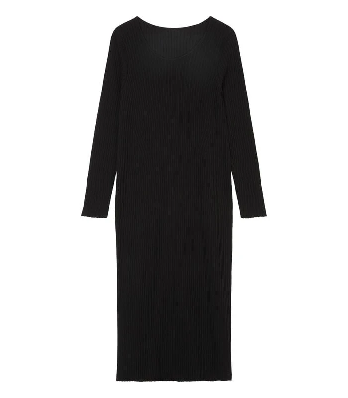 Ziet er verfrissend minimalistisch uit, is casual met stretch, laat het vrouwelijke silhouet perfect uitkomen, zorgt ALTIJD voor een sportieve en elegante look en is supercomfortabel: de ribgebreide jurk. Het aansluitende model is gebreid van een zacht, luxe garen van een mix met biologisch katoen en legt door de fully–fashioned details de focus op de taille. De kokerjurk heeft een wijde, ronde hals, een Franse afwerking van de schouders en lange, smalle mouwen. Catwalklook: combineer met stoere chunky Chelsea boots.