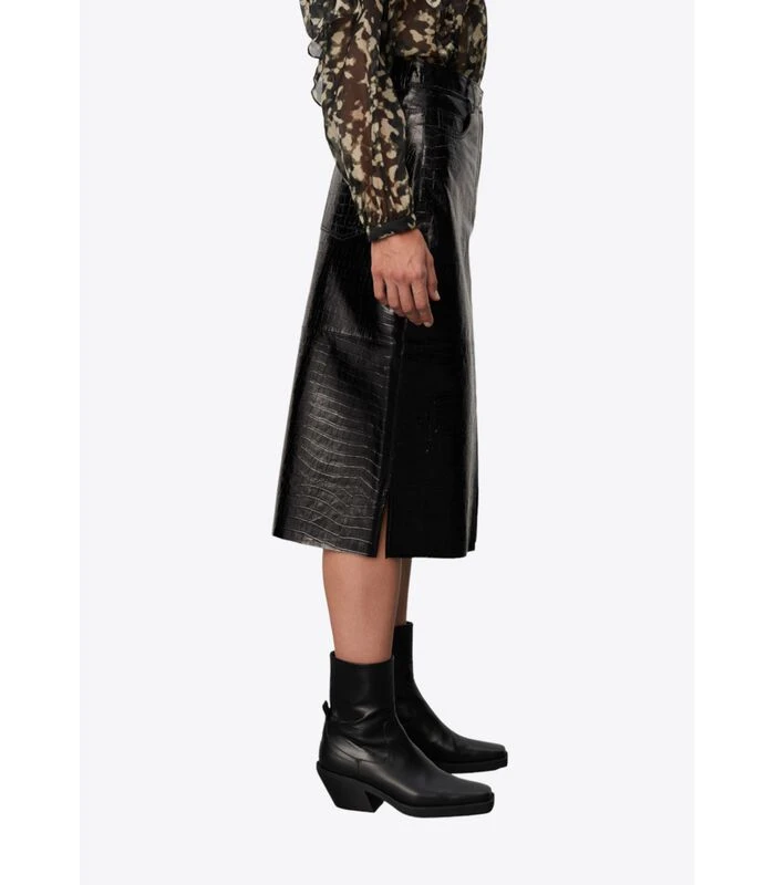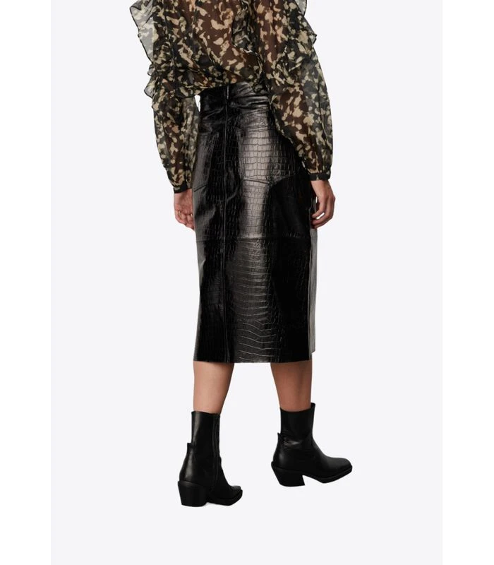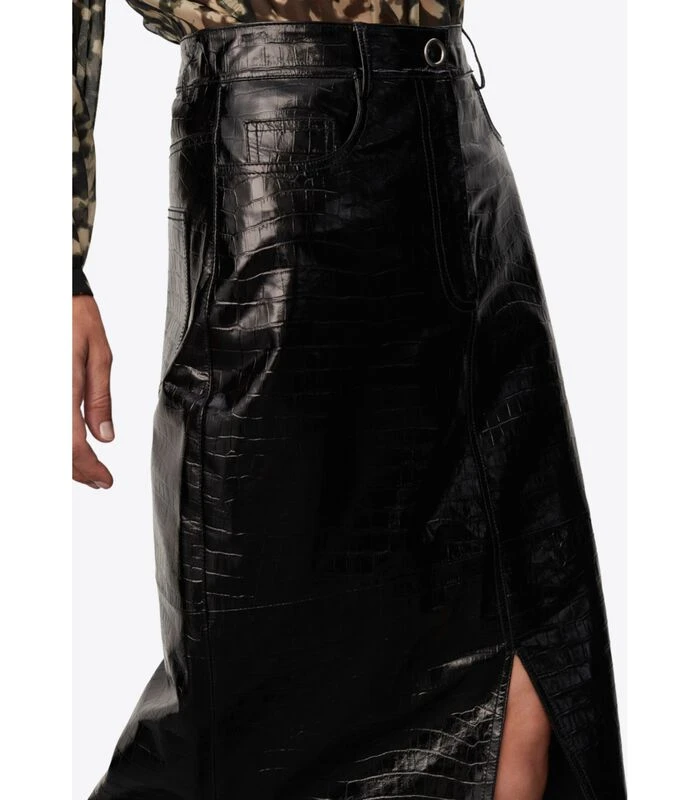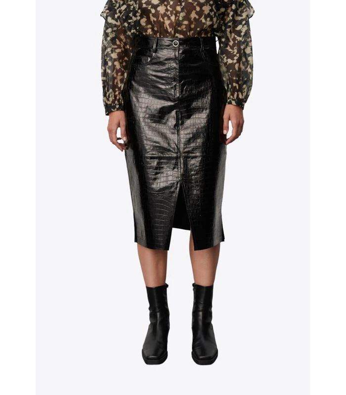 Deze halflange kokerrok van lakleer heeft een croc–look textuur. Hij heeft een split aan de voorkant, opgestikte zakken aan de achterkant en steekzakken. De rok is gevoerd tot aan de knie