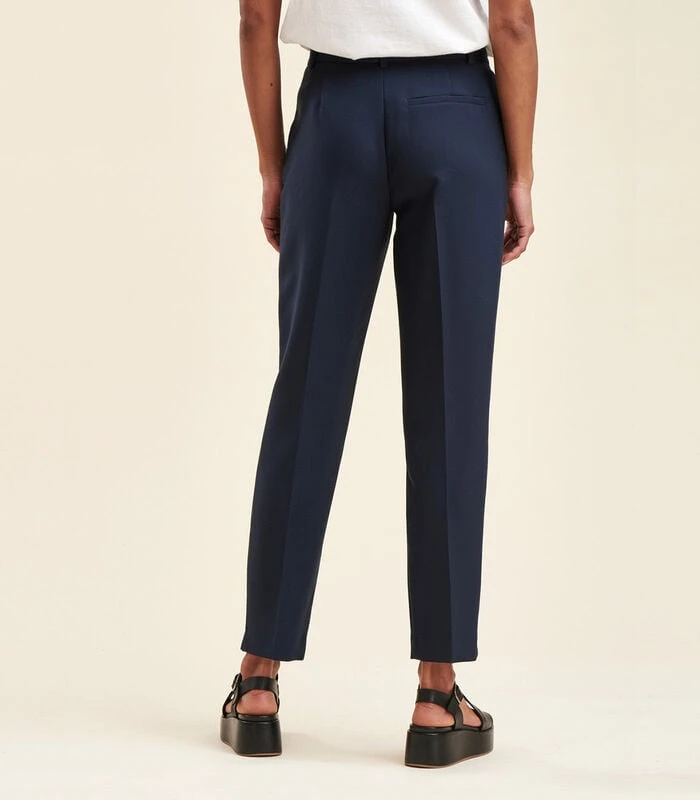 Sigarettenbroek van gerecycled polyester, 7/8e lengte, mid–rise taille, haak– en oogsluiting en verborgen knoop onder placket. Gulp met rits. Italiaanse zakken (op de zijkant). Ecologisch verantwoord model van gerecycled polyester. RCS EGL/252903.Ons model is 1m77 lang en draagt maat 36/S.Dit model past normaal, neem uw gebruikelijke maat. 37% Gerecycled Polyester 36% Polyester 20% Viscose 7% Elastaan Voering: 100% Polyester