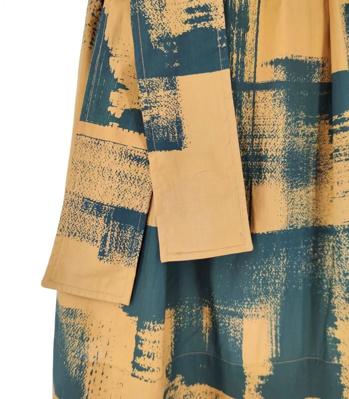 Sunpan en groene katoenen jurk zonder mouwen en stoffen riem met taille โ breed snijden