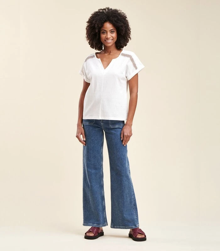 Dit t–shirt heeft een fancy V–halslijn, korte mouwen met een klein manchet en een opengewerkt vlechtje. Ons model is 1m77 en draagt maat 36/S. Dit model draagt normaal, dus neem uw gebruikelijke maat. 95% Katoen 5% Elastaan