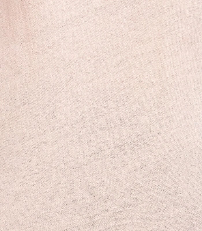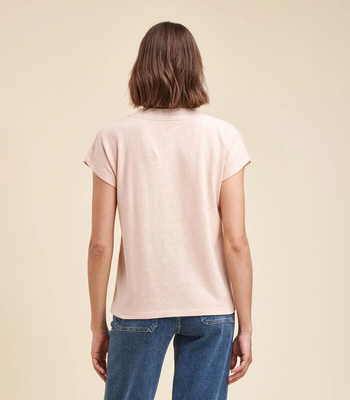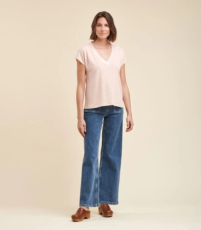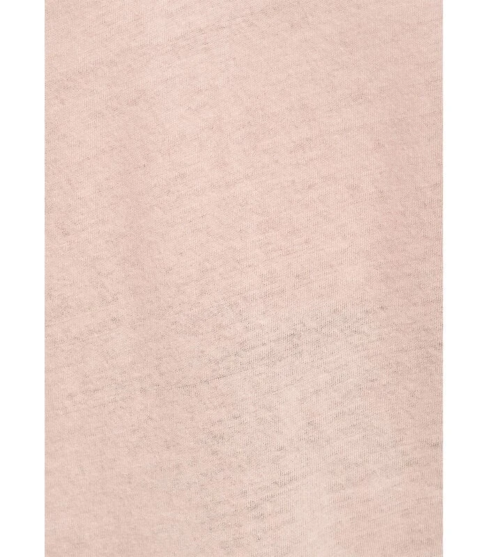 Een zeer vrouwelijk t–shirt van katoen en linnen met een licht glanzende folie afwerking, V–hals met tonale ribbels, korte mouwen, recht model, tonaal gestikte zoom onderaan de mouwen en de onderkant van het t–shirt. 100% Lijn