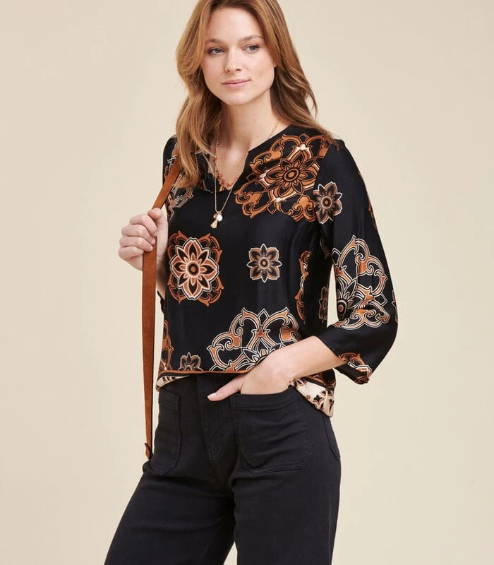Tuniek met technische print, Tunesische halslijn, 3/4 pagode–mouwen.Ons model is 1,90 m en draagt maat 36/S.Dit model valt normaal, neem uw gebruikelijke maat. 100% Viscose
