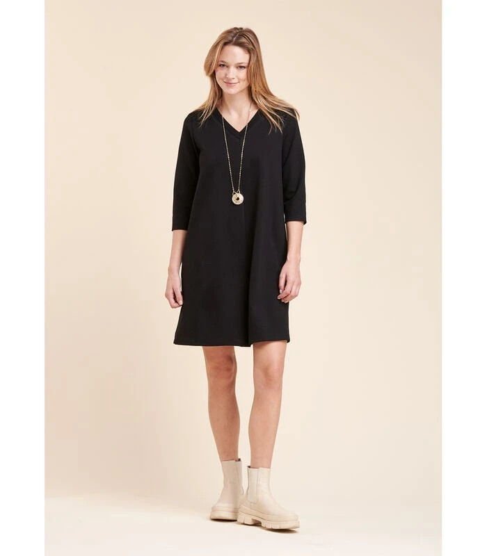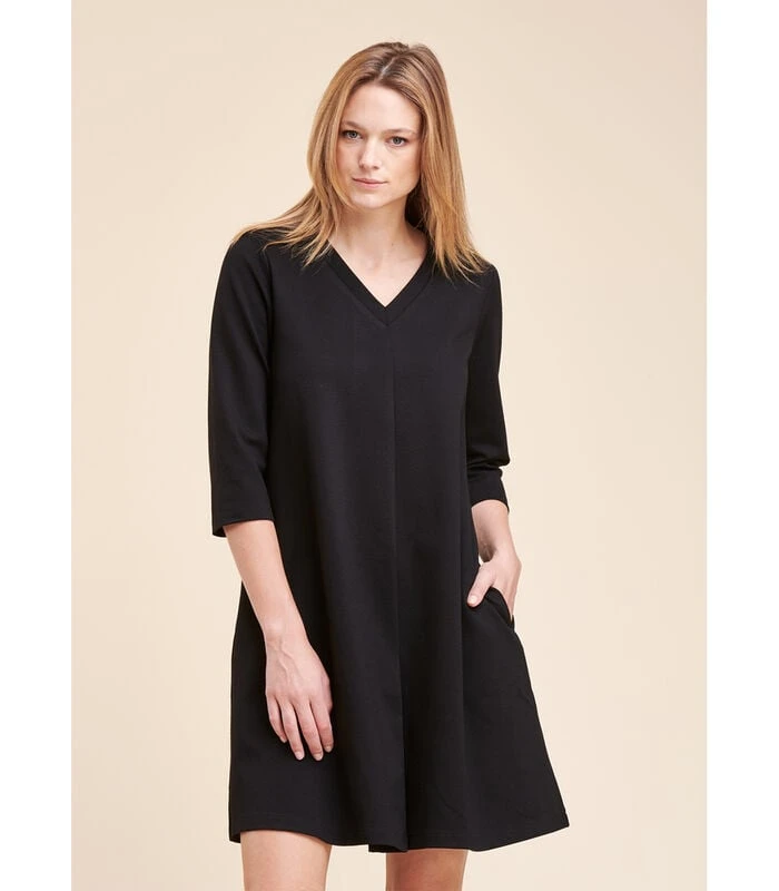 Korte uitlopende jurk van milano jerseystof. 3/4–mouwen en V–hals. 65% Viscose 30% Polyamide 5% Elastaan