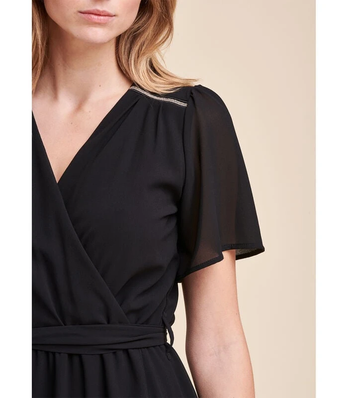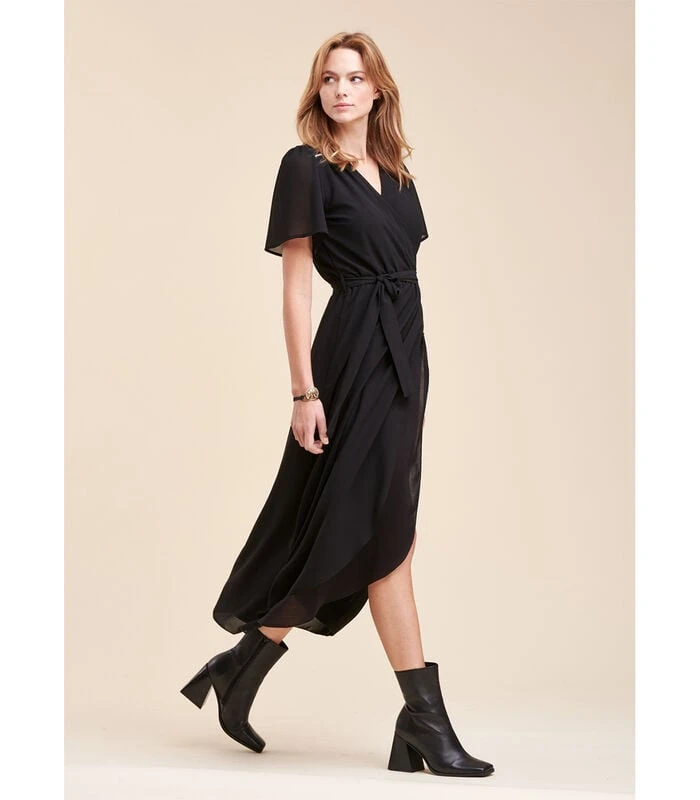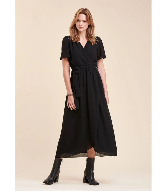 Lange jurk van polyester voile, wikkelhals, korte mouwen, schouderuitsnijdingen met plooien en fantasievlechtwerk, elastische taille–uitsnijding met ceintuur om vast te knopen, uitlopende onderkant met afgeronde overslag, gevoerde jurk. 100% Polyester Voering: 100% Viscose